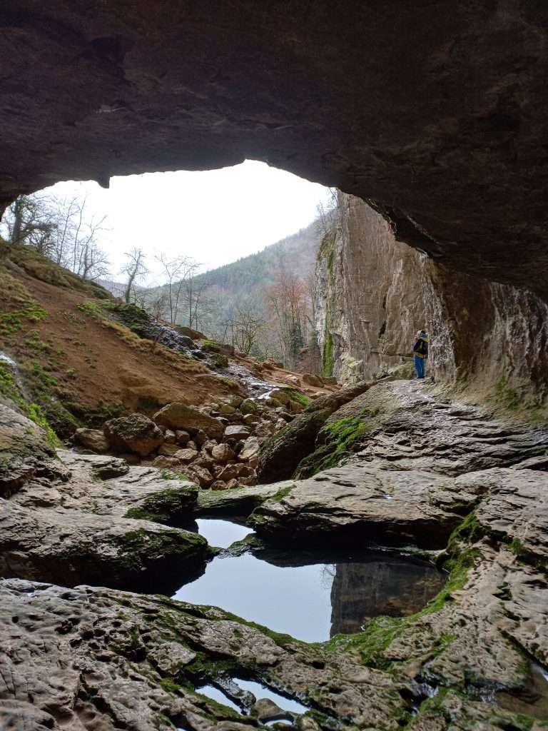 The tour of the karst sites was led by Marc Steinmann and Jean-Baptiste Charlier. Bad weather prevented us from admiring the landscape at the Monmahoux viewpoint, so the tour began with a first stop at the source of the Lison, where the geological and hydrogeological contexts were presented, as well as the issues related to water contamination, particularly by nitrates, leading to eutrophication of waterways and fish mortality. We then headed to the magnificent site of the source of the Lison, then to the Sarrazine cave, where the spring acts as an overflow system. The second stage of the visit took us to the source of the Verneau, where water levels and nitrate concentrations have been monitored since 2020 using a Spectro-Lyser Scan probe. At the same time, lysimeters on the plateau measure drainage from the meadows into the karst system in order to assess the sources of pollution found downstream in the waterways.
